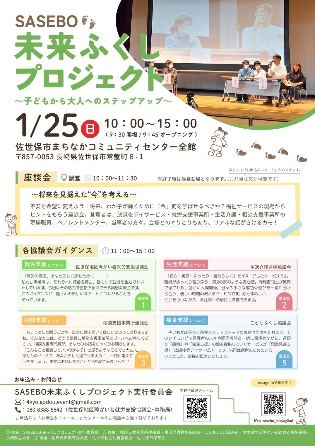 本年度も相談支援事業所連絡会・生活介護連絡協議会・こどもふくし協議会・佐世保地区障がい者就労支援協議会の4協議会の合同事業として、『令和7年度SASEBO未来ふくしプロジェクト~子どもから大人へのステップアップ~』を開催する運びとなりました。